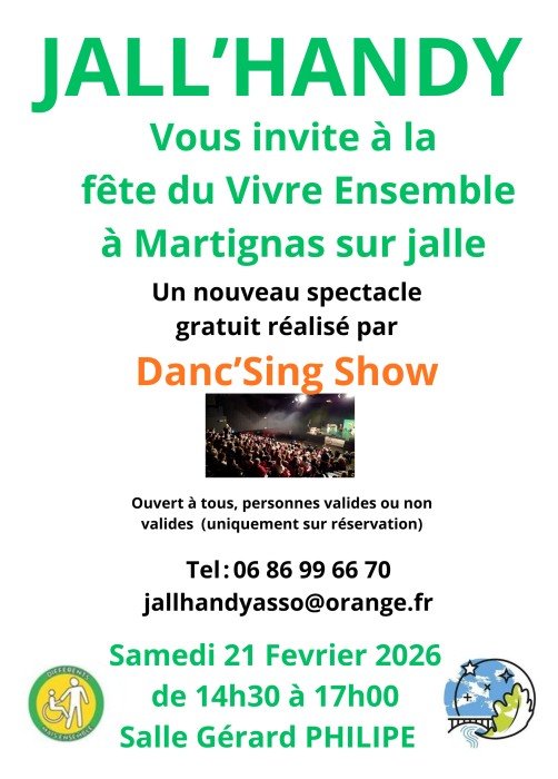 Samedi 21 février 14h30salle Gérard Philipe, MartignasSpectacle Danc'sing Show Entrée gratuite sur réservation auprès de l'association Jall'handy 06.86.99.66.70